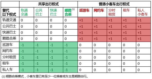 辦理交通擁堵,需要經(jīng)過(guò)報價(jià)、通勤時(shí)刻等要素規劃,推進(jìn)出行構造中各方式之間的彼此代替,朝減輕交通擁堵的有利方向開(kāi)展。每添加一趟出行,若一位正本挑選同享出行方式的乘客,轉而挑選網(wǎng)約專(zhuān)車(chē),其對城市交通是“添堵”的(+1,路途新增一輛小客車(chē)的負荷);若一位正本挑選私家小客車(chē)出行方式的乘客,轉而挑選網(wǎng)約專(zhuān)車(chē),其對削減路途本錢(qián)占用并無(wú)顯著(zhù)裨益(0)。除了運轉功率也許會(huì )帶來(lái)路途本錢(qián)使用功率的細小不同,網(wǎng)約專(zhuān)車(chē)與其它小客車(chē)出行方式之間的相互代替,對減輕交通擁堵并無(wú)顯著(zhù)影響。