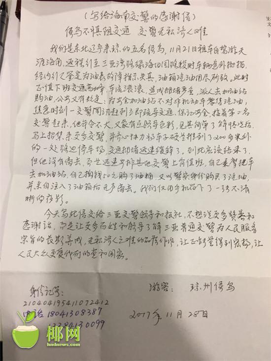 原來(lái),11月20日,來(lái)自遼寧撫順石油三廠(chǎng)、50歲的程女士帶著(zhù)母親、阿姨等5人來(lái)三亞旅游,并在三亞灣路預訂了客房,在網(wǎng)上租了一輛車(chē)。21日下午,程艷一行自駕游南山、天涯海角后,于當天下午5時(shí)左右返程,行至三亞灣綠海田園鄰近路段時(shí),車(chē)輛意外出毛病拋錨熄火,后來(lái)發(fā)現是油箱汽油竭盡所造成的。合理她們束手無(wú)策之際,友誼派出所路管員林玉桐、周日康等人聞?dòng)嵑筅s來(lái)幫忙,將車(chē)輛推到路旁邊的停車(chē)場(chǎng),之后林玉桐乘摩托車(chē)去加油站,自己掏錢(qián)購買(mǎi)了油桶和汽油,為她們的車(chē)輛注入汽油后離去,這讓程女士非常感動(dòng)。